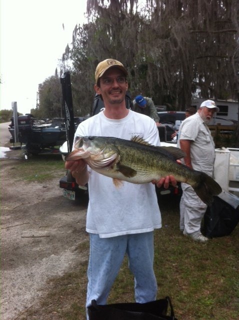 That's me with probably the biggest fish I've ever caught, a 9.90 pound freak.  She ate a Bass Pro Shops Squirmin' Swim Shad (which has been discontinued) in 6 ft of clear water in scattered submerged offshore hydrilla in Lake Toho.  I probably should have shaved and paid attention while the photo was being taken so the look on my face was less ridiculous.  (Photo by Alan Elder)