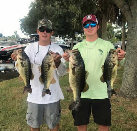 Third place was claimed by Clayton Clark and (Dad) Greg Clark of Palm Bay with a limit weighing 15.20 pounds. Good thing Clayton brought along an experienced partner who taught him everything he knows about bass fishing. Clayton landed the Big Bass of the tournament which tipped the scales at 5.35 pounds and gave them the 5 extra bonus points. They reported that a eight inch black worm and a red shad worm proved the best bait of the day.