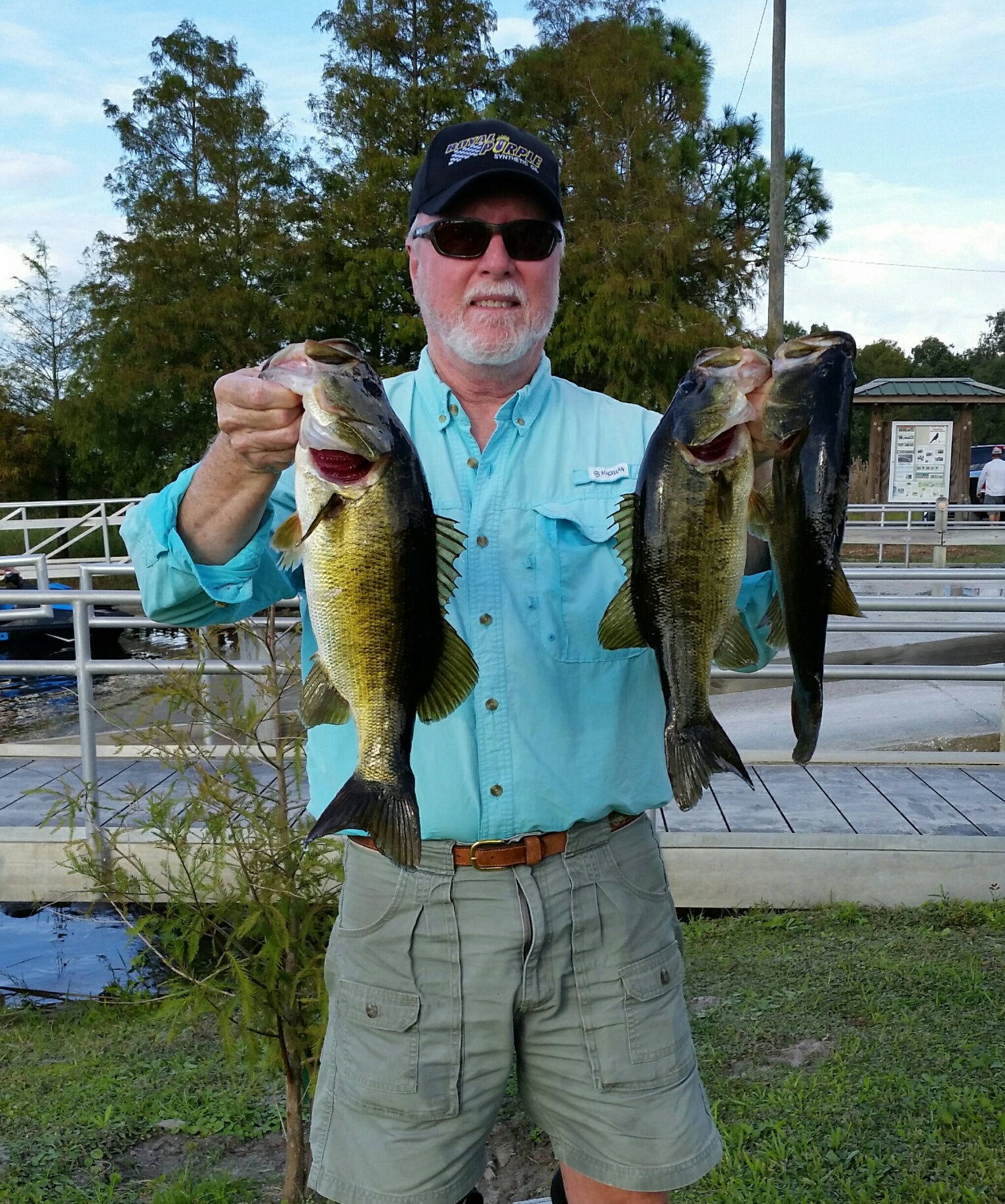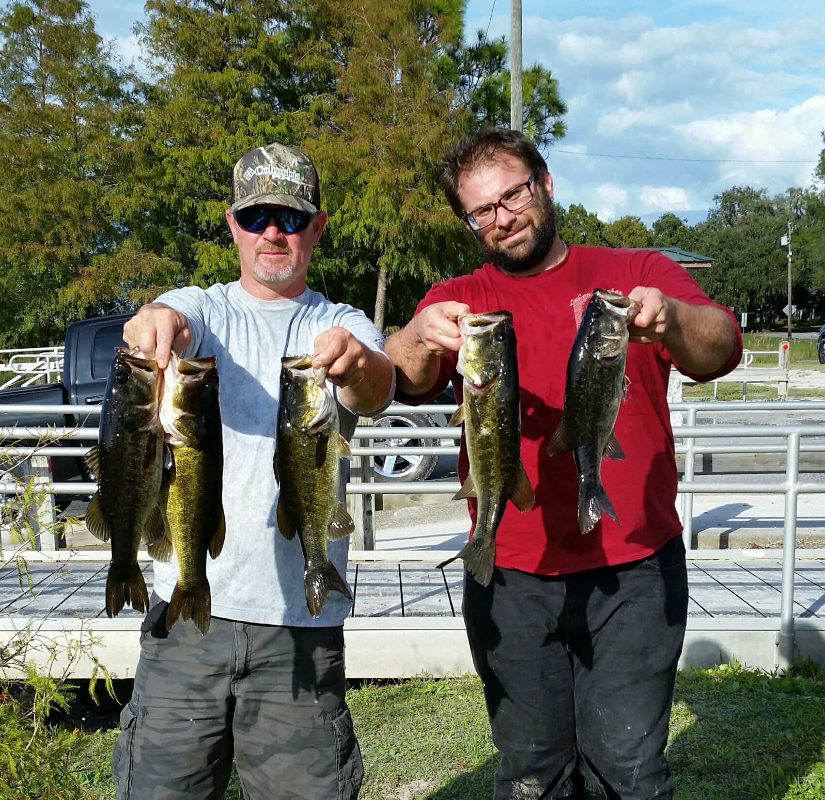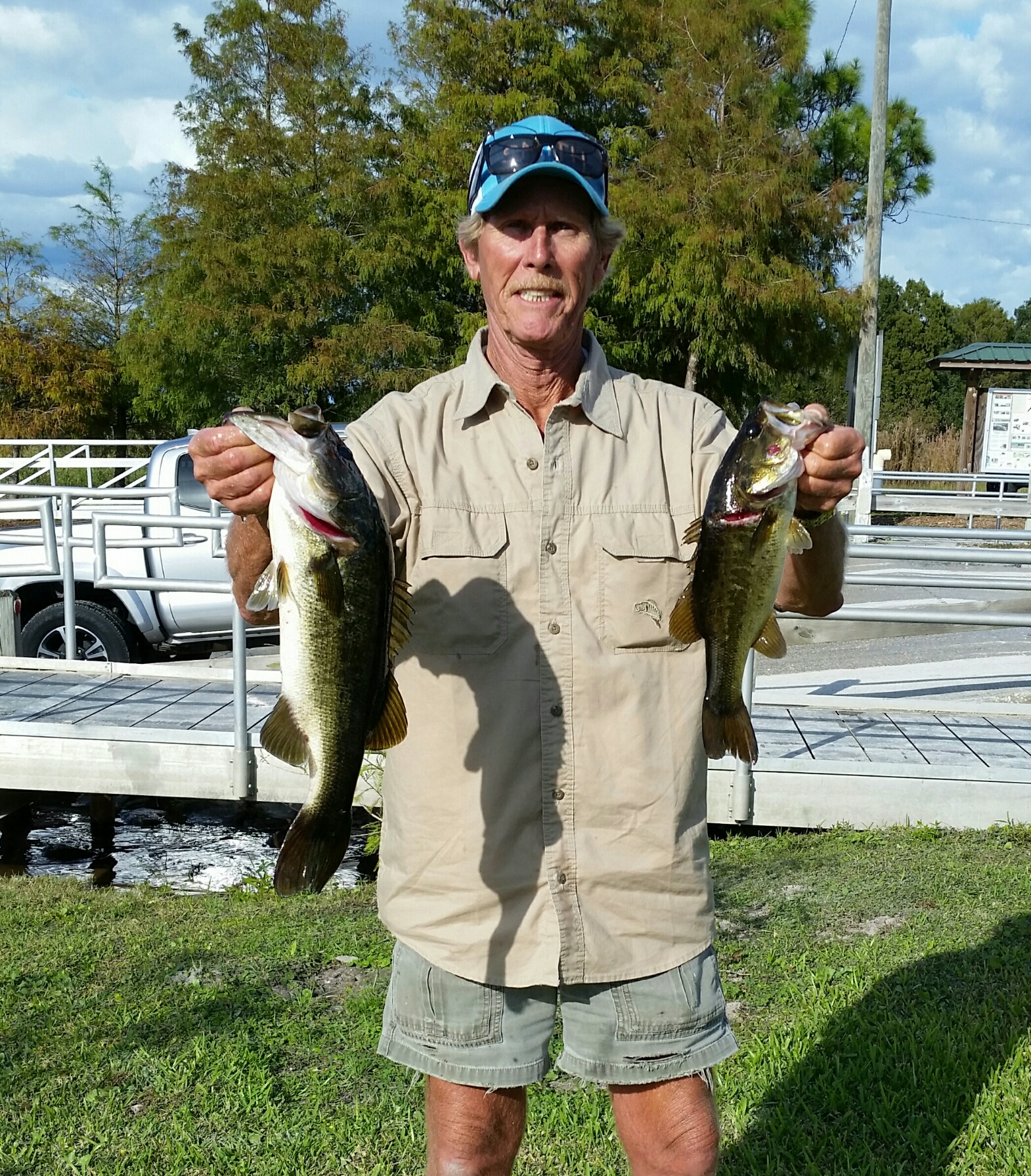 Space Coast Bass Finatics held their third tournament of the season at Ralph Chisholm Park on East Lake Toho and there were many challenges to overcome before the day was over. The first seemed to be just to find the launch ramp after which finding a place to dock your boat without getting your feet wet was next. Finding fish in the lake or its adjoining lakes and canals proved to be just as tough. The club history on this body of water has been one of small fish, low weights, changing conditions, windy weather and down right dangerous conditions. The weather was great for us as we started the day off with a nice cool morning with some variable winds and then a nice warm up as the day ended. The club did add two new or almost new teams as Mark and Tyler Williams returned from last year and Dave Tripp (partner TBD) became our twenty-seventh and twenty-eight teams to sign up this year which means we only have two spaces available for the year to become the thirty team club we wanted to be. President Bill was doing double duty as VP William Flood is undergoing some medical treatment and probably will be out for a couple of months. There seemed to be a lot of alternates fishing with us this month, seven in all, but maybe it was because of East Lake Toho's pass results. We still fielded twenty-seven teams which is another milestone for the club. Bill then sent everyone out with a reminder for good sportsmanship and to be extra careful in the connecting canals between the lakes. The weigh-in began precisely at three pm with the help of Matt Byrd on the golden rule measuring fish and checking for dead fish also Mike Calloway was working the camera so that we can get those big limits on the web site for all to see.