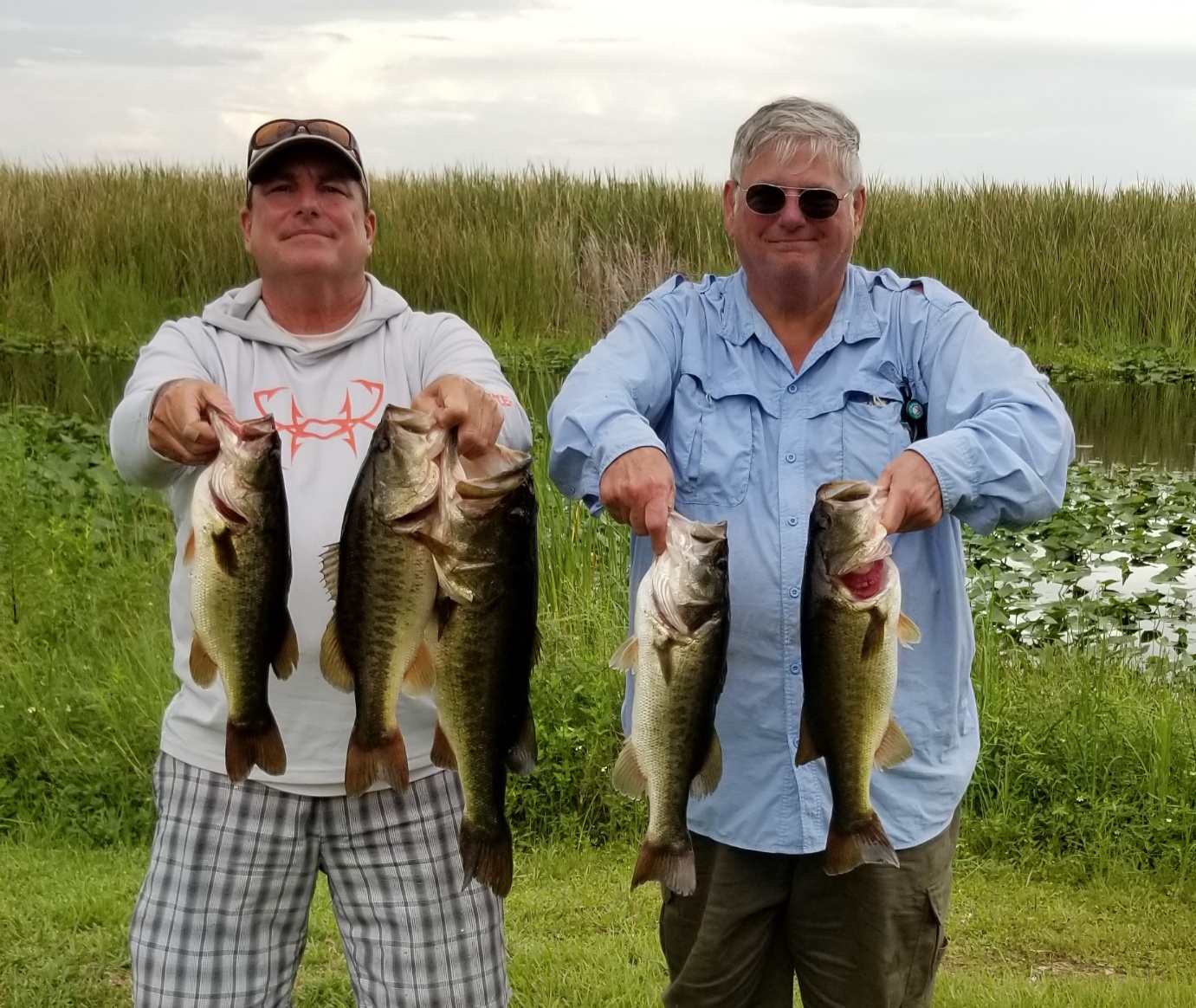 AFTER FORECASTS OF RAIN ALL MORNING, ONCE AGAIN THE WEATHERMAN WAS WRONG, BUT MOTHER NATURE MADE UP FOR IT STARTING ABOUT NOON WITH RAIN SQUALLS, WIND AND MASSIVE AMOUNTS OF LIGHTENING, SOME OF WHICH WERE WAY TO CLOSE. IN THE END, IT WAS THE TEAM OF ROGER AND AARON MAREK WHO FOUND THE RIGHT QUALITY, TAKING 1ST PLACE WITH 21.96# INCLUDING A 7.63# KICKER BY ROGER. THANKS TO “BIG FISH” AARON FOR LETTING DAD CATCH THE BIG ONE. THAT DOESN’T HAPPEN TOO OFTEN AS IT’S AARON WHO IS USUALLY HOLDING THE BIG BASS. FOR THEIR HARD WORK, THEY COLLECTED $1125 FOR FIRST AND AN ADDITIONAL $200 IN THE CALCUTTA. FOLLOWING CLOSELY IN 2ND PLACE WAS THE TEAM OF CLIFF SEMONSKI AND KEITH BRAUN WITH 19.91# INCLUDING KEITH’S 7.20# SHOT AT BIG BASS OF THE DAY. GOOD BAG GUYS. THEIR EFFORTS WON THEM A COOL $675. NOT BAD FOR A DAY ON THE WATER WITH NO ENTRY FEE. IN THIRD PLACE WITH 18.38# WERE FRED REID AND JOHN KINCHEN WITH A VERY RESPECTABLE 6.17# KICKER BY FRED. THEIR HAUL WAS $450. TAKING 4TH PLACE WITH 17.75# WERE ROB BRANAGH AND JAY STEIN, WHO DELAYED HIS MOVE TO TENNESSEE IN ORDER TO FISH THE CLASSIC. ROB CAPTURED BIG BASS OF THE TOURNAMENT WITH A 7.88# GIANT WHICH WAS WORTH $200 PLUS TWO $50 GIFT CARDS FROM CLUB SPONSOR STRIKE ZONE FISHING OF MELBOURNE. THANK YOU SHAWN MECCHELLA.
