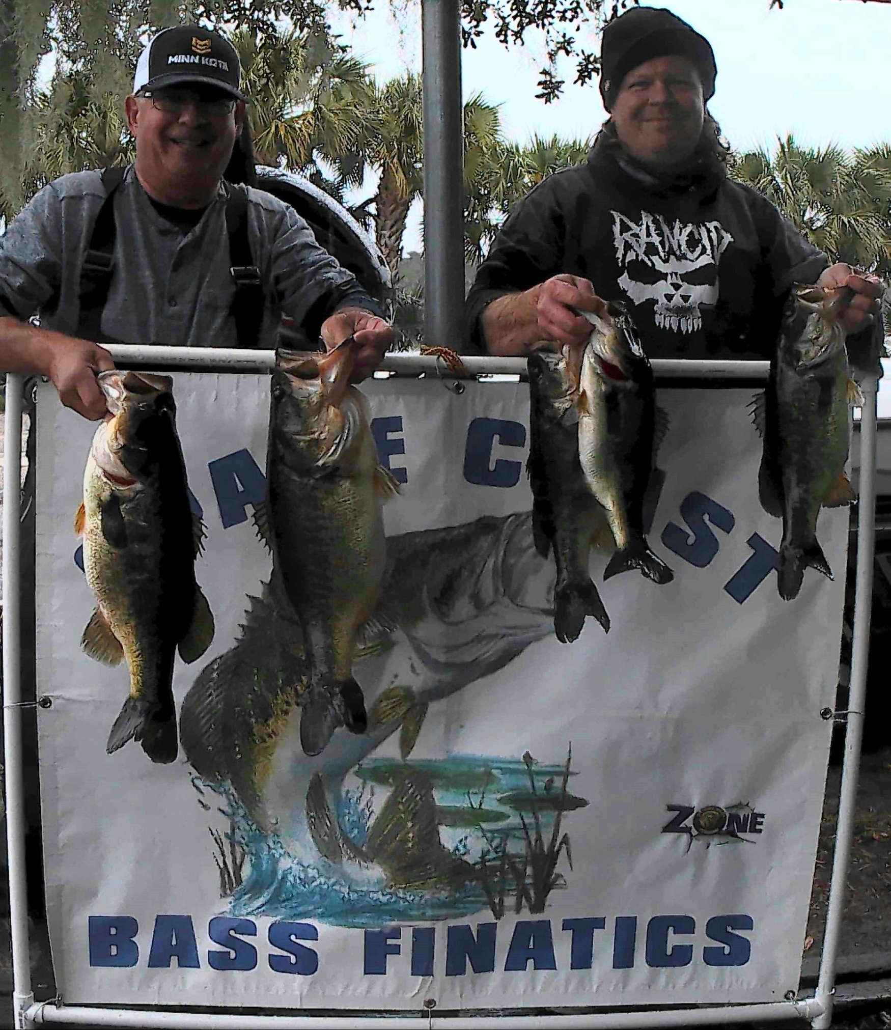 The fourth tournament of the season occurred on January 14th on Lake Kissimmee. The tournament was originally scheduled for late last year, but weather got in the way forcing the club to reschedule for safety reasons. Unfortunately, the weather was quite different from the forecast for this event. The good news is the bass did not mind, but tournament members were faced with cold, rainy, and windy conditions. The weather had winds out of the north at 10+ mph. The water temperature was in the low sixties, and the air temp never got above 55. This tournament saw a large spread between 1st and 2nd place. The first place team also had a big bass caught by Alan Elder with a huge 7.14 lbs. lunker. He and Daville Williams secured a 21.55 lbs. bag for first place. Their chosen top bait was Yum/dingers. Second place went to Brian Cole and Brian Davidson (alternate) who landed a 12.94 lbs. bag using rat/traps and Senkos. Third place went to Roger Averill and Dustin Beard, who caught a 12.25 lbs. bag using trick worms. Roger needed to secure a place in the top three to help pay for the prop that came apart during the tournament … sorry Roger, but glad no one was hurt ☹. Congratulations to all team participants who chose to endure the weather conditions. Most teams chose to stay in lake Kissimmee while others chose to head as far north as Lake Toho. The MLF College Championship was held the week before and teams landed some impressive bags on the south side of Toho. Unfortunately, they left few for our club to catch. At least two of the top three teams chose to stay on Lake Kissimmee and secured a good bag of fish. North cove proved to provide some large lunkers for the tournament. After the tournament, members stayed for a short meeting and voted on the Harris Chain location/timing since the Toyota Series will have tournament on same day. The vote was unanimous to keep the schedule with no change. Fred Reid and John Kinchen won the two StrikeZone gift cards. Thanks goes to StrikeZone for their support and long-time sponsorship. The turnout for this event was 13 boats, so we are still a little low in membership. Hopefully more teams will join in for all the great fun and competition that tournament bass fishing provides. The next tournament will be at Garcia on January 28th. Geico will be sponsoring the next tournament at Lake Garcia