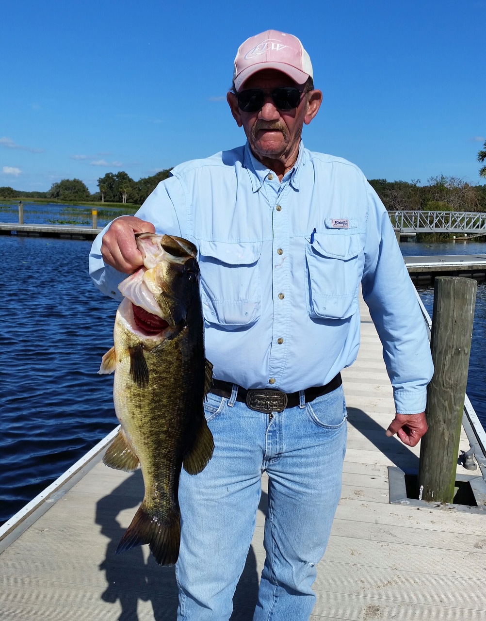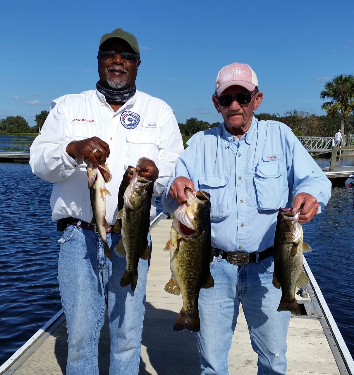 Larry Cruce and Tim Iler decided to stay in Lake Kissimmee and avoid most of the wind by fishing in the northeast section of the lake. This good decision paid off with a first place limit weighing 16.18 pounds. Using their usual spinning reel and top water baits (devil horse) proved to be the answer to catching their limit along with a giant 7.10 pound hydrilla gorilla that claimed the big bass honors. This was quite a turnaround from last month where they narrowly missed the small creel prize.