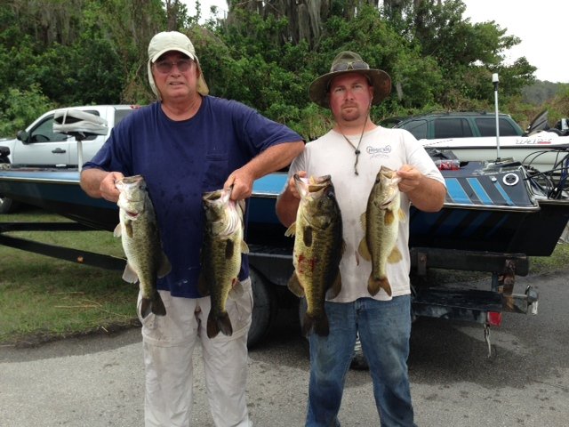 That's Clyde Taylor (left) and his son Raymond Taylor (right) with the best 4 of their 23.80 pound winning weight on West Lake Tohopekaliga on February 24, 2013. That one in Raymond's right hand is a 9.33 pound giant. They reported catching them by flipping craws and worms in the shallows of Lake Toho. All fish were returned to the lake to spawn and be caught again. (Photo by Alan Elder)