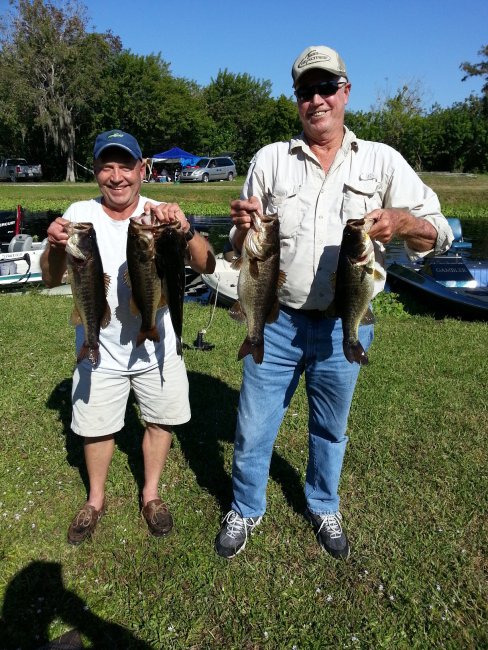 That's Tim Iler (left) and Larry Cruce (right) displaying their 3rd place 15.93 pound stringer at Blue Cypress Lake on October 27, 2013.  (Photo by Mike Calloway)