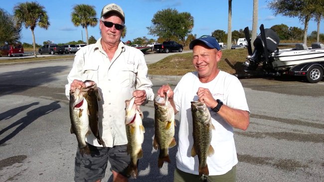 That's Larry Cruce (left) and Tim Iler (right) with 18.72 pounds of bass they weighed to win our tournament at Garcia on November 17, 2013. They reported catching them on topwater and jerk baits in the north western part of the lake. (Photo by Mike Calloway)