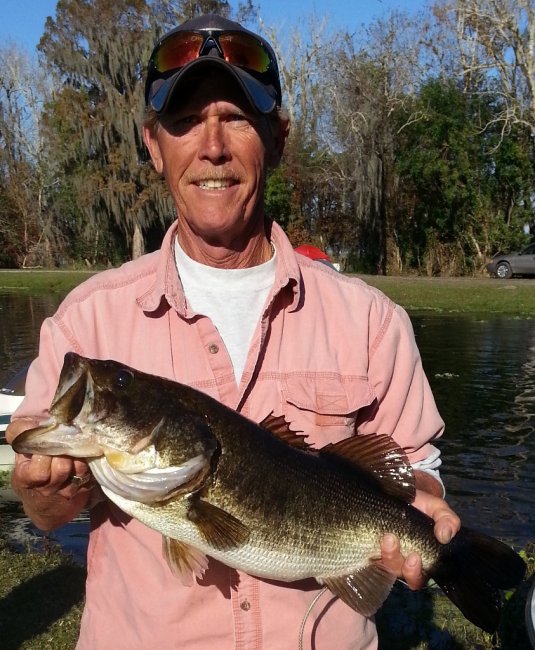 Jack Berry displays his 7.98 big bass from Blue Cypress Lake on December 14, 2014. Jack is supporting the fish's weight with both hands to prevent undue strain to its jaw. He reported catching it on a Texas rigged Zoom Ol' Monster Worm. (Photo by Mike Calloway)