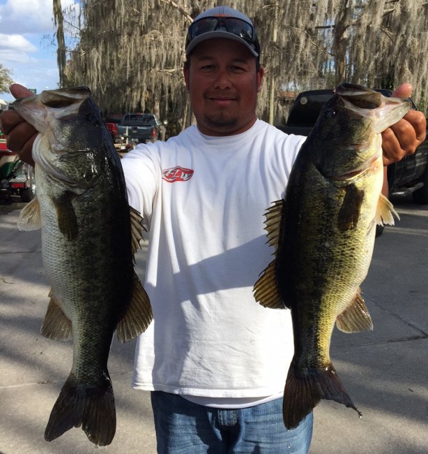 That's Santos "Junior" Solis with the best 2 of 15.03 pounds he and Jim Folks caught on lipless crankbaits over submerged vegetation and flipping in Lake Toho. They reported catching the majority of the weight first thing in the morning on the lipless crankbait bite in a quick flurry. Their catch took 2nd at our Lake Cypress event on February 22, 2015. (Photo by Alan Elder)